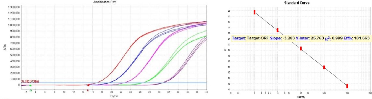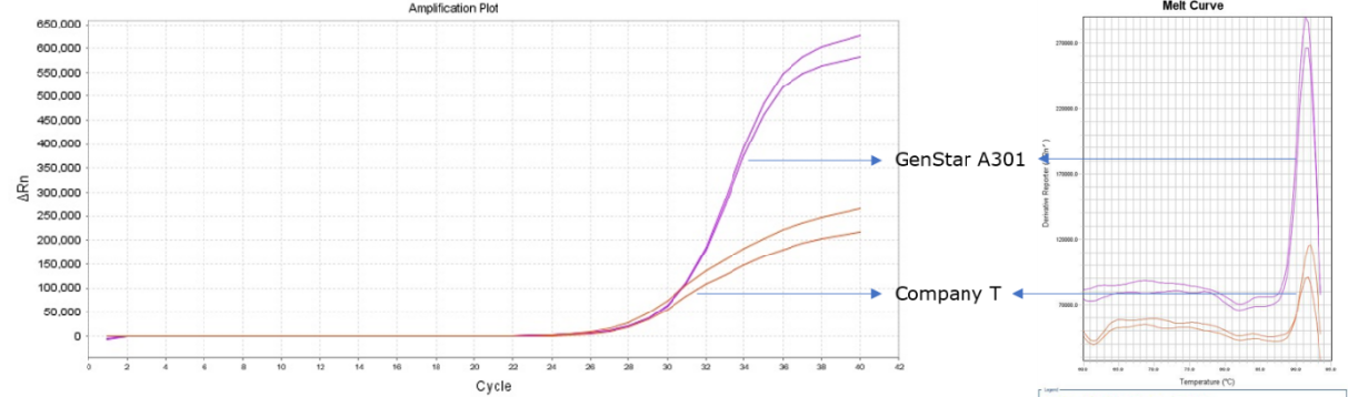 以 Hela 細(xì)胞 cDNA 為模板,按10倍濃度梯度稀釋,根據(jù) Ct 值構(gòu)建標(biāo)準(zhǔn)曲線。結(jié)果顯示,GenStar #A301 擴增效率高、標(biāo)準(zhǔn)曲線線性范圍寬、重復(fù)性好。
