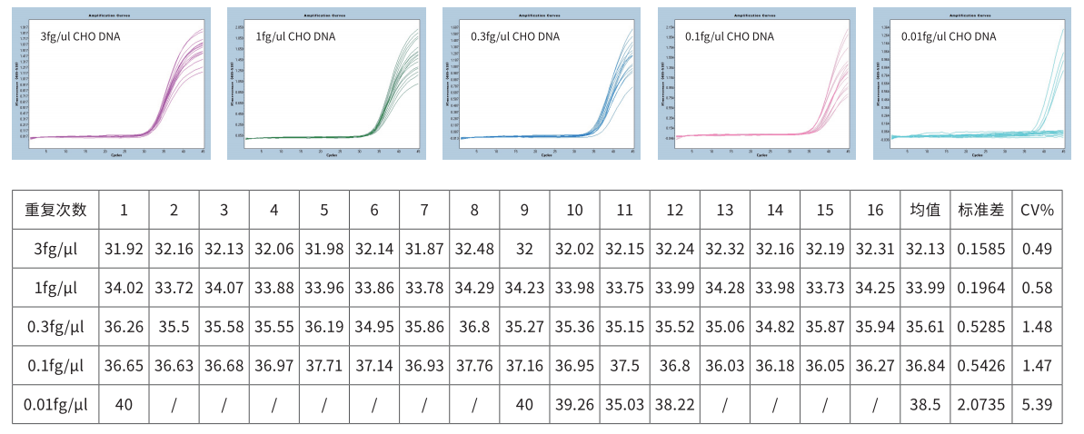 檢測(cè)濃度為 3 fg/μl、1 fg/μl、0.3 fg/μl、0.1 fg/μl、0.01 fg/μl CHO DNA,每個(gè)濃度梯度設(shè)置 16 個(gè)重復(fù)。0.3 fg/μl 及以上濃度 16 個(gè)重復(fù) Ct 值 CV<5%,即 GenStar #A802 最低檢測(cè)限可達(dá) 0.3 fg/μl。