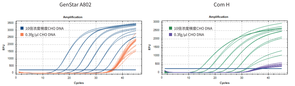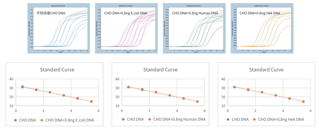 在不同濃度 CHO DNA 中分別加入 0.8 ng E.coli、Human、Hek 干擾 DNA,干擾組與對(duì)照組基本重合,未見干擾。可見 GenStar #A802 特異性很強(qiáng),不同細(xì)胞系間無(wú)交叉反應(yīng),結(jié)果更準(zhǔn)確。