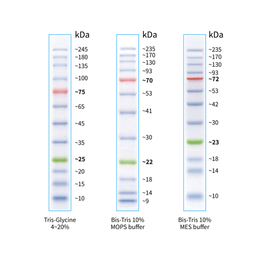 本產品由跨度從 10-245 kDa 的 12 種高度純化預染的重組蛋白質組成,各條帶濃度約為 0.1-0.4 mg/ml。其中 25 kDa 條帶為綠色預染條帶,75 kDa 條帶為紅色預染條帶,方便判斷各個條帶的準確位置。本產品適合作為 SDS-PAGE 電泳時,變性蛋白樣品的分子量參照,并可實時觀察蛋白樣品的電泳分離狀況,也可用于檢測 Western blot 的轉膜效率。由于共價結合的染料會影響蛋白質分子的電泳遷移率,本產品僅適于粗略地估計目的蛋白樣品的分子量。