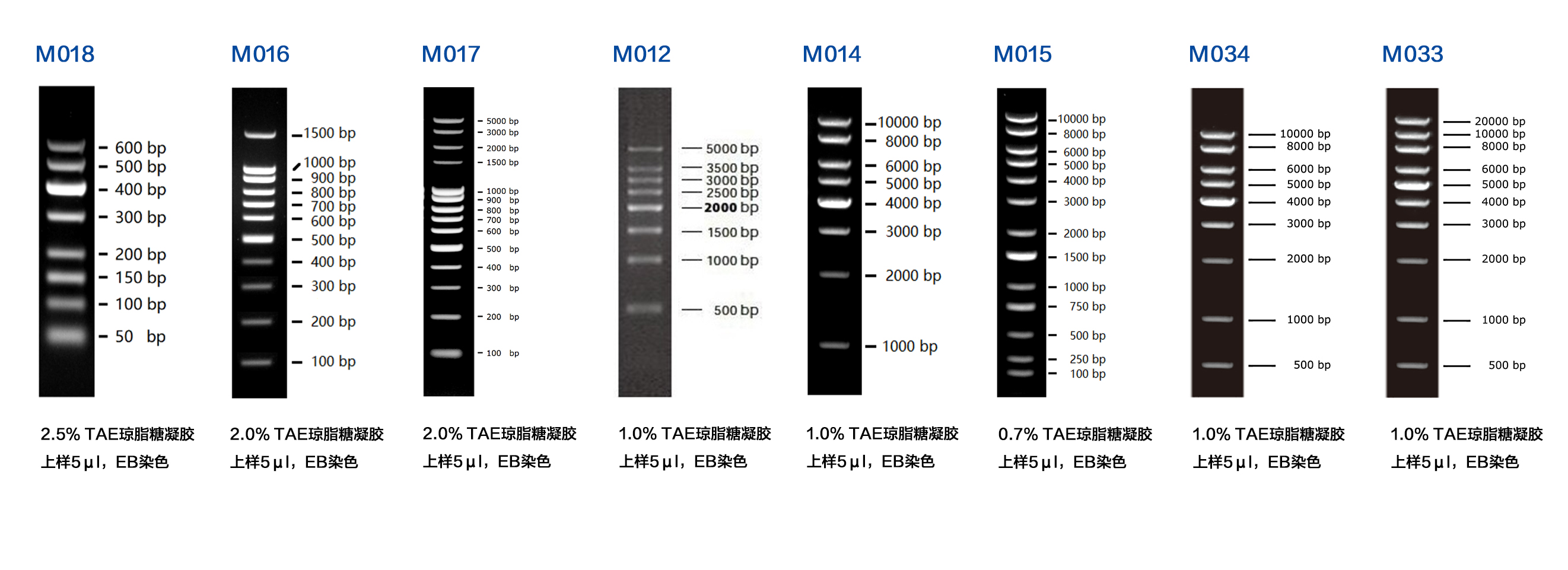 本產(chǎn)品為預(yù)混有 1x 上樣緩沖液的即用型 DNA 分子量標(biāo)準(zhǔn),由 8 條線狀雙鏈 DNA 條帶組成,適用于對(duì) 1000-10000 bp 的雙鏈 DNA 分子大小的估算和粗略定量。本產(chǎn)品的 8 條帶分別為 1000、2000、3000、4000、5000、6000、8000 和 10000 bp。其中 4000 bp 條帶濃度最大,為 20 ng/µl,其余條帶濃度約為 10 ng/µl。