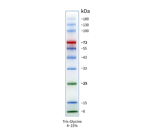 本產品包含了 8-180 kDa 的 10 種高度純化預染的重組蛋白質。10 種條帶分別為:8、15、25、33、43、55、72、100、130、180 kDa。其 8 kDa 和 25 kDa 條帶為綠色預染條帶,72 kDa 條帶為橙紅色預染條帶,方便判斷各個條帶準確位置。 本產品包裝便利,為即用型產品,請勿加熱、稀釋或添加還原劑。使用本產品可動態(tài)觀察蛋白電泳狀態(tài)和轉膜效果。經 SDS-PAGE 電泳后轉移到 PVDF 膜、NC 膜上可見清晰的彩色條帶。預染蛋白與染料結合后,在不同緩沖體系中,位置會有遷移,本產品在用于判斷目的蛋白分子量大小時僅供參考。
