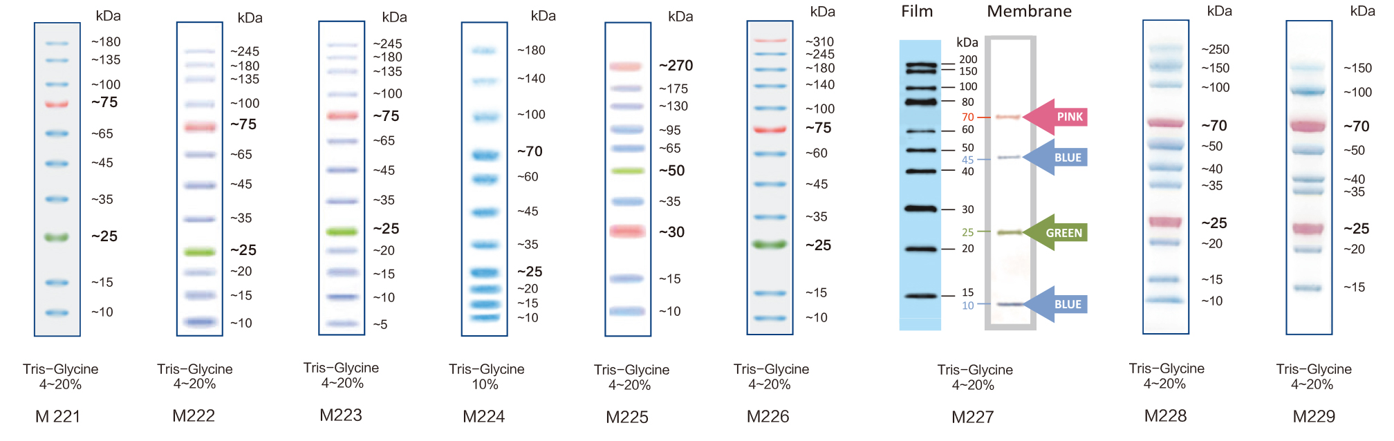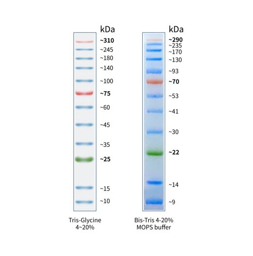 本產(chǎn)品由跨度從 10-310 kDa 的 12 種高度純化預(yù)染的重組蛋白質(zhì)組成,各條帶濃度約為 0.1-0.4 mg/ml。其中 25 kDa 條帶為綠色預(yù)染條帶、75 kDa 和 310 kDa 條帶為紅色預(yù)染條帶,方便判斷各個(gè)條帶的準(zhǔn)確位置。本產(chǎn)品適合作為 SDS-PAGE 電泳時(shí),變性蛋白樣品的分子量參照,并可實(shí)時(shí)觀察蛋白樣品的電泳分離狀況,也可用于檢測(cè) Western blot 的轉(zhuǎn)膜效率。由于共價(jià)結(jié)合的染料會(huì)影響蛋白質(zhì)分子的電泳遷移率,本產(chǎn)品僅適于粗略地估計(jì)目的蛋白樣品的分子量。