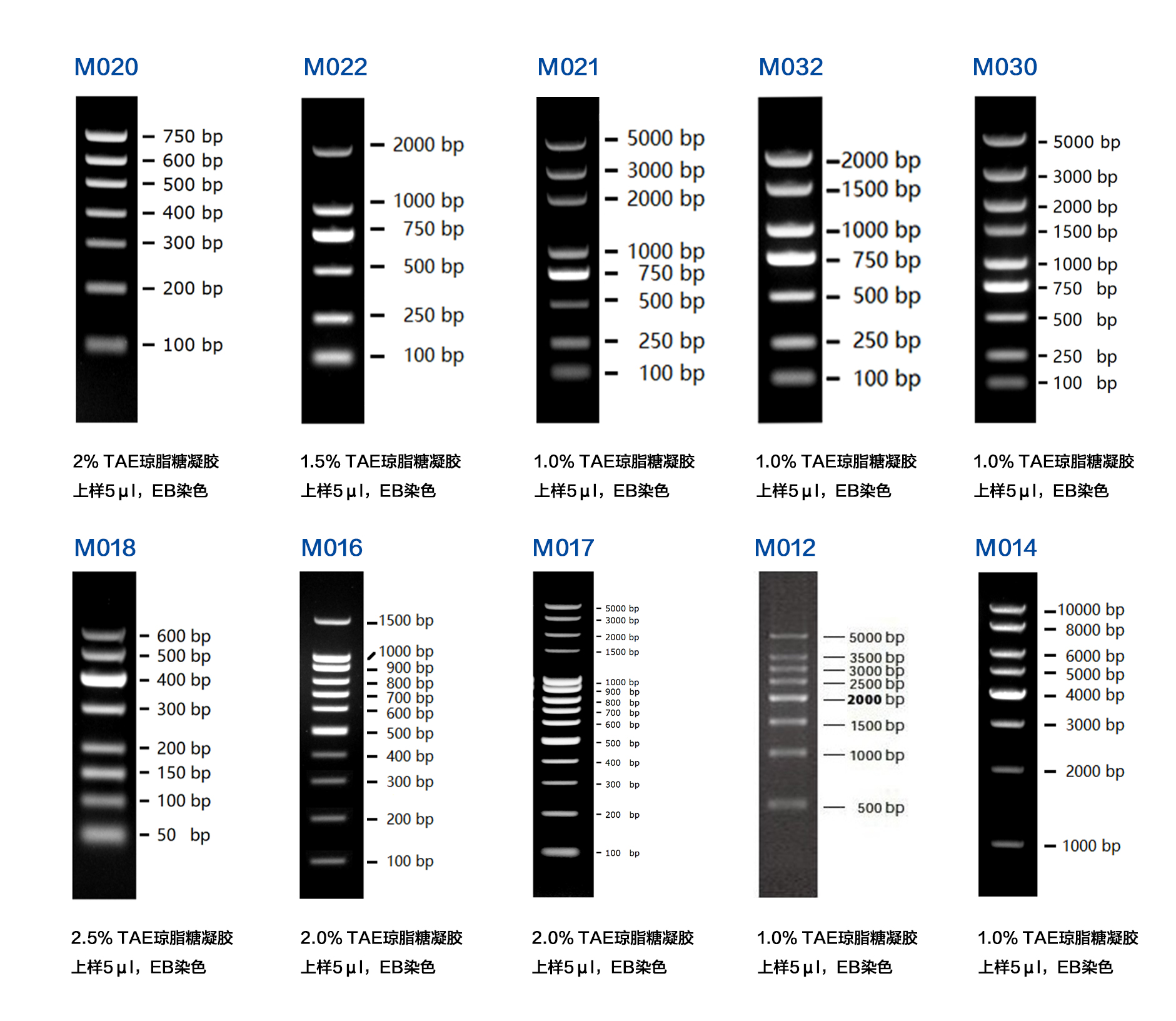本產(chǎn)品為預(yù)混有 1x 上樣緩沖液的即用型 DNA 分子量標(biāo)準(zhǔn),由 8 條線狀雙鏈 DNA 條帶組成,適用于對 50-600 bp 的雙鏈 DNA 分子大小的估算和粗略定量。本產(chǎn)品的 8 條帶分別為 50、100、150、200、300、400、500 和 600 bp。其中 400 bp 條帶濃度最大,為 10 ng/µl,其余條帶濃度約為 5 ng/µl。