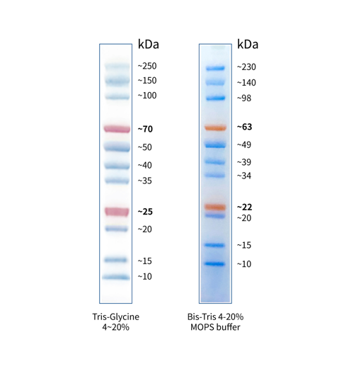 本產(chǎn)品由跨度從 10-250 kDa 的 11 種高度純化的橙色、藍色預染蛋白質(zhì)組成。其中 25 kDa 條帶和 70 kDa 條帶為橙紅色預染條帶。本產(chǎn)品適合作為 SDS-PAGE 電泳時,變性蛋白樣品的分子量參照,并可實時觀察蛋白樣品的電泳分離狀況,也可用于檢測 Western blot 的轉(zhuǎn)膜效率。由于共價結合的染料會影響蛋白質(zhì)分子的電泳遷移率,本產(chǎn)品僅適于粗略地估計目的蛋白樣品的分子量。