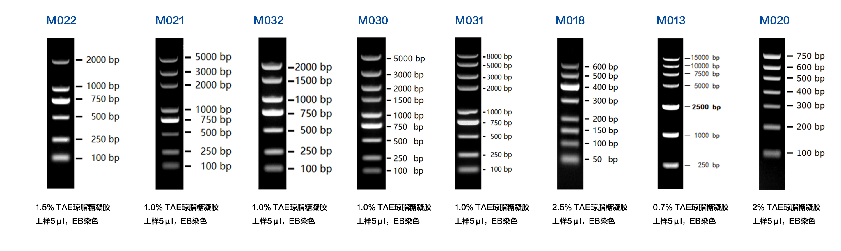 本產(chǎn)品為預(yù)混有上樣緩沖液的即用型 DNA 分子量標(biāo)準(zhǔn),由 8 條線狀雙鏈 DNA 條帶組成,適用于對 100-5000 bp 的雙鏈 DNA 分子大小的估算和粗略定量。本產(chǎn)品的 8 條帶分別為 100、250、500、750、1000、2000、3000 和 5000 bp。其中 750 bp 條帶濃度最大,為 100 ng/5 µl,其余條帶濃度約為 50 ng/5 µl。
