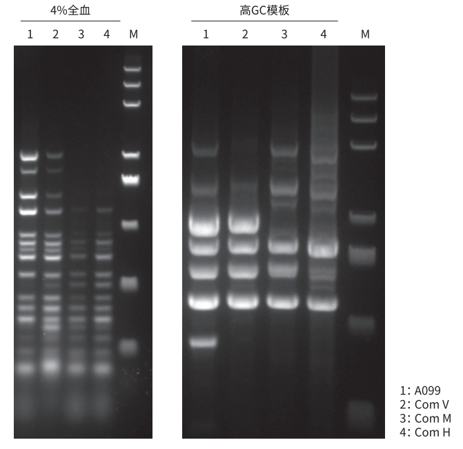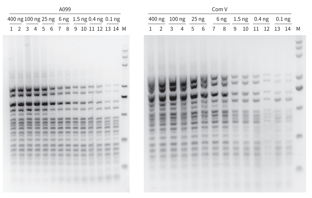 以 Human 基因組為模板,同時(shí)擴(kuò)增 19 個(gè)目的片段。結(jié)果顯示,A099 最低檢測(cè)限可達(dá) 0.1 ng,不會(huì)出現(xiàn)條帶丟失且條帶清晰優(yōu)于 Com V