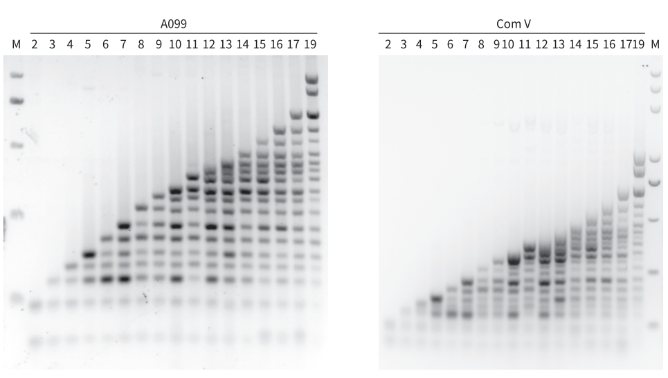 以 Human 基因組為模板,擴(kuò)增 2~19 重目的片段(50-1028 bp)。結(jié)果顯示,所有目的片段都清晰可見(jiàn),A099 可在同一反應(yīng)中擴(kuò)增多達(dá) 19 個(gè)目的片段,且擴(kuò)增效率和條帶清晰度均優(yōu)于 Com V