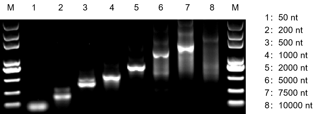 GenStar #R101 可高度特異識(shí)別 T7 啟動(dòng)子序列,能夠合成 50-10000 nt 的 RNA 產(chǎn)物。
