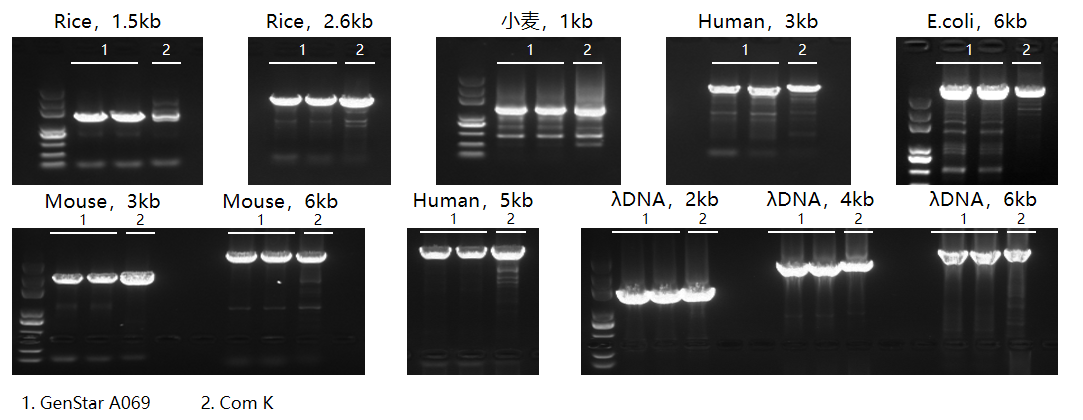 GenStar 2×SuperNova HTS PCR Mix(#A069) 靈敏度與 Com K 相當,對于簡單模板(如 λDNA),模板濃度可檢測低至 pg 級。