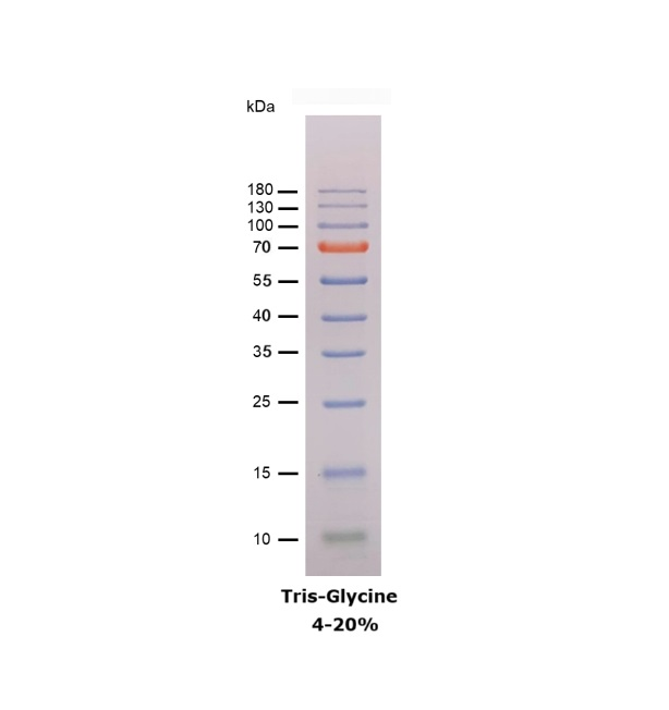 本產(chǎn)品由跨度從 10-180 kDa 的 10 種高度純化預(yù)染的重組蛋白質(zhì)組成。其中 10 kDa 條帶為綠色預(yù)染條帶,70 kDa 條帶為紅色預(yù)染條帶,方便判斷各個(gè)條帶的準(zhǔn)確位置。本產(chǎn)品適合作為 SDS-PAGE 電泳時(shí),變性蛋白樣品的分子量參照,并可實(shí)時(shí)觀察蛋白樣品的電泳分離狀況,也可用于檢測(cè) Western blot 的轉(zhuǎn)膜效率。由于共價(jià)結(jié)合的染料會(huì)影響蛋白質(zhì)分子的電泳遷移率,本產(chǎn)品僅適于粗略地估計(jì)目的蛋白樣品的分子量。