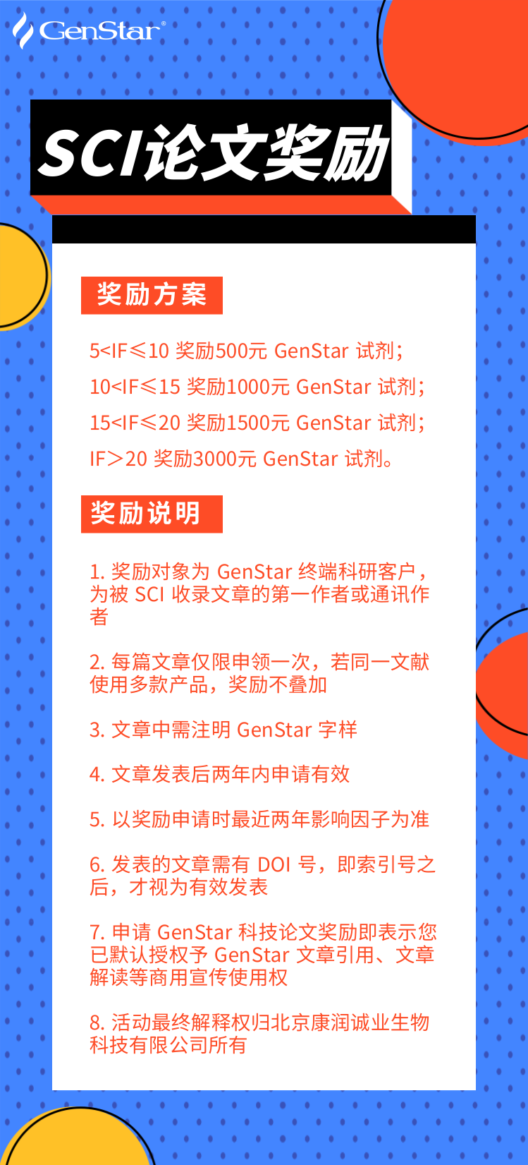 GenStar 自成立以來(lái),一直深耕于分子生物學(xué)領(lǐng)域上游核心原料及配套體系的研發(fā),服務(wù)了全國(guó)數(shù)千家實(shí)驗(yàn)室的科研人員。使用 GenStar 產(chǎn)品的 SCI 論文總數(shù)已達(dá)千余篇,其中包含《Nature》、《Science》、《Cell》等高水平的學(xué)術(shù)期刊。為了感謝廣大客戶的支持與信任,GenStar 繼續(xù)推行發(fā)表科技論文獎(jiǎng)勵(lì)機(jī),使用 GenStar 產(chǎn)品發(fā)表科技論文的人員均可申請(qǐng)。希望更多新老客戶參與其中,期待和您一起分享成功的喜悅。
