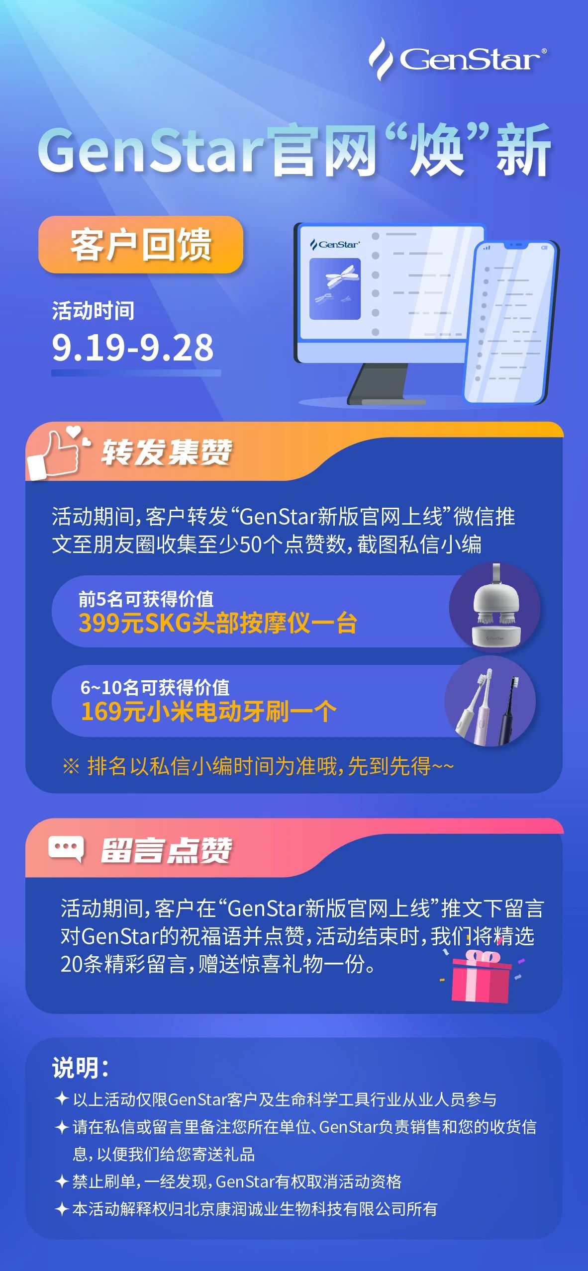 1. 轉(zhuǎn)發(fā)GenStar公眾號推文(可點擊此處跳轉(zhuǎn))至朋友圈點贊數(shù)滿50,截圖私信GenStar公眾號鎖定禮品,滿24h后再次截圖并備注單位,負責銷售和收貨信息。無文章保留24h截圖視為棄權(quán),獲獎者順延一位。