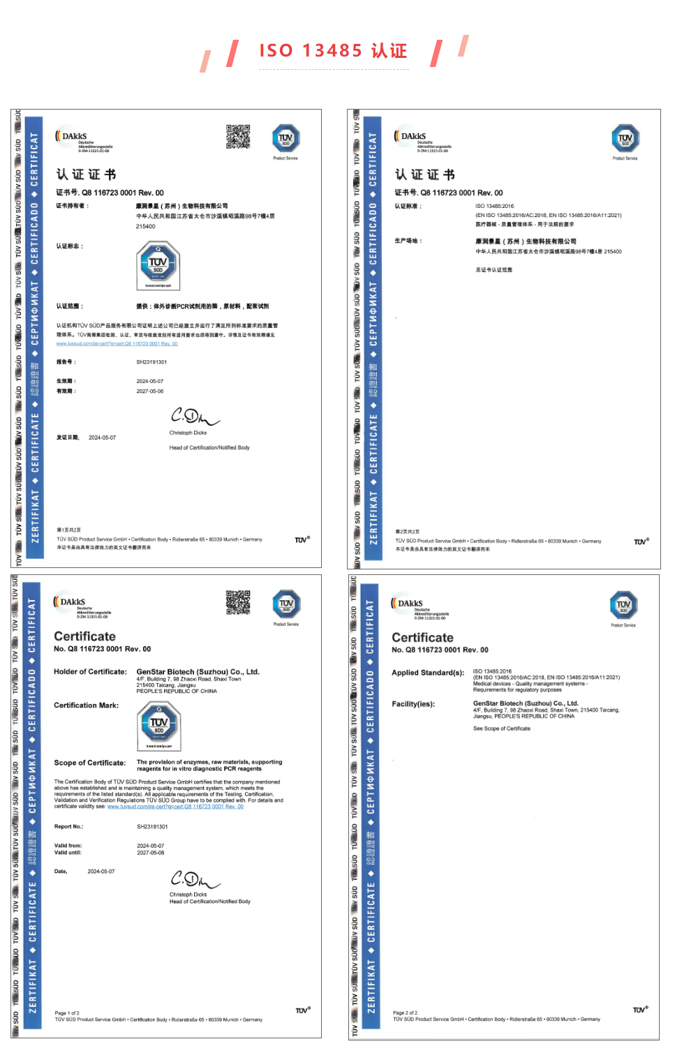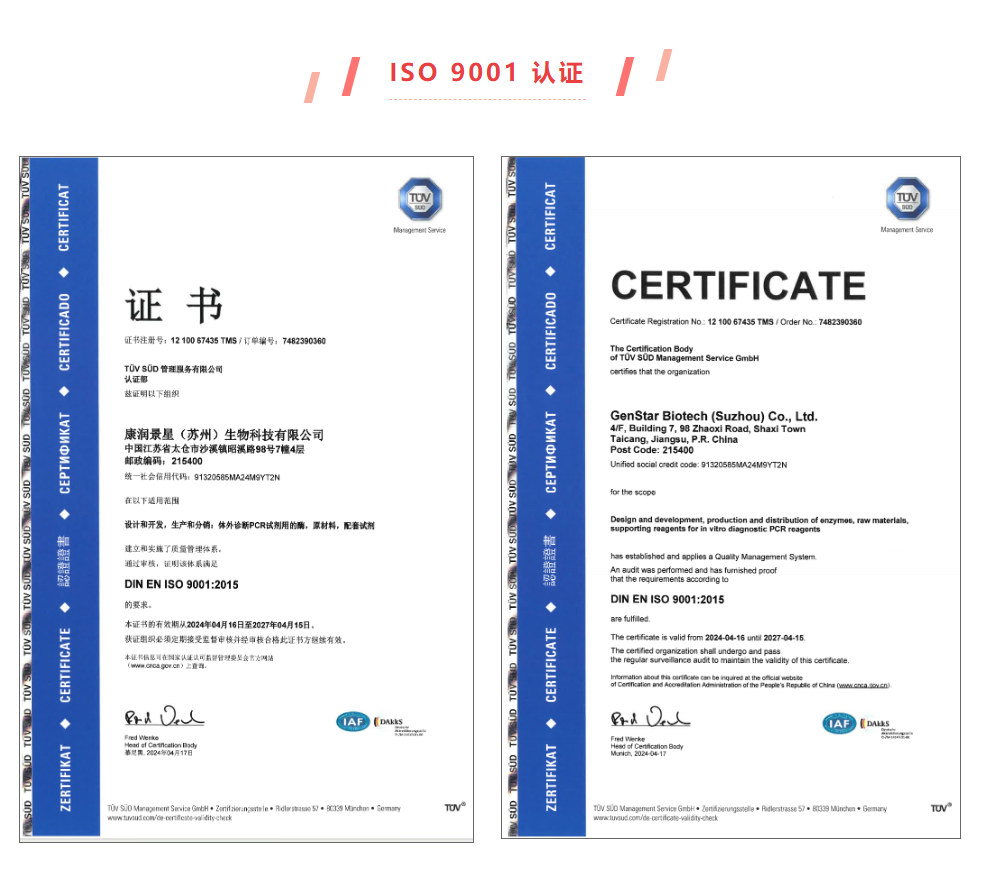 近日,康潤(rùn)景星(蘇州)生物科技有限公司(GenStar全資子公司)經(jīng)國(guó)際第三方檢測(cè)認(rèn)證機(jī)構(gòu)TÜV南德意志集團(tuán)(以下簡(jiǎn)稱“TÜV南德”)的嚴(yán)格審查,再次通過ISO9001:2015質(zhì)量管理體系和ISO13485:2016醫(yī)療器械質(zhì)量管理體系認(rèn)證審核,并獲得證書。